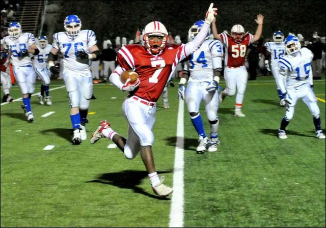 Fort Hill’s Johnathan Foster celebrates as he crosses the goal line on a seven-yard touchdown run 14 seconds before halftime that gave the Sentinels a 14-7 lead over the Allegany Campers in the Class 1A West Region Final Friday night at Greenway Avenue Stadium. Fort Hill defeated Allegany for the second time in two weeks, 21-14. (PHOTO BY: Steve Bittner)