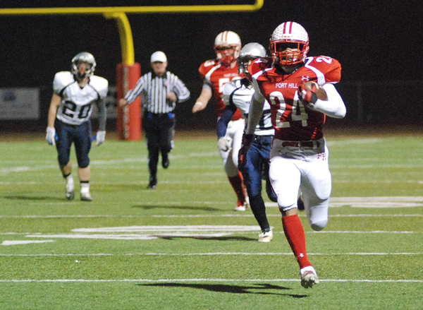 Nov. 16, 2013 CUMBERLAND — Top-seeded Fort Hill struck early and pounded often in using its quick-strike capability and age-old physicality to advance to the Maryland 1A West Region championship game with a 46-7 semifinal victory over fourth-seeded Manchester Valley Friday night at Greenway Avenue Stadium. Ty Johnson, picking up where he left off in last Saturday’s Homecoming Game, put the Sentinels (11-0) on the board 50 seconds into the contest with a blazing 63-yard touchdown run and then the Sentinels blasted away up front to wear down the Mavericks on both sides of the ball, rushing for 327 yards on 31 carries, and bottling up Manchester Valley’s hard-running Jake Fernandez to 76 yards on 23 carries and the Mavericks to just 68 rushing yards total. The victory ensures the Sentinels a date in the region title game against another Carroll County team, third-seeded North Carroll, which edged second-seeded Hancock on Friday, 14-13. The West Region championship will be determined Friday, 7 p.m., at Greenway Avenue Stadium. Manchester Valley defeated North Carroll last week in the regular-season finale, 27-8. “We started off a little rough,” said Fort Hill head coach Todd Appel. “We made some mistakes, but I think we were physical and played with a lot of intensity. Football should be fun because it is physical, and as the game rolled on our physical play took over. “We took advantage of mistakes and in the end showed we were the better team.” The Sentinels wasted very little time in showing it as, on the second play from the line of scrimmage, Johnson took a handoff left, cut in, found the seam and then burst to the outside and outran the field for a 63-yard touchdown run at 11:10 of the first quarter, with the first of Chris King’s six successful kicks making it 7-0. King kicked five extra points as well as a 38-yard field goal. Johnson finished the game with 155 yards rushing and three touchdowns on five carries, all in the first half, as Fort Hill took a 31-7 lead at the break. Fullback Dekarai Darr rushed for 92 yards and two touchdowns on 13 carries, and Alex Barnes picked up 42 yards on eight carries, scoring Fort Hill’s final touchdown. The Sentinels came up with four turnovers, with Barnes recovering a fumble and intercepting a pass, and Ryan Shives and Johnson also picking off passes. “We didn’t make plays at times, but we did,” said Appel. “We had three interceptions. They’re a pretty physical team, but we showed we’re more so. It’s a tribute to our weight program; it’s how we’ve been all year. We just have to keep on a roll, do what we’re supposed to do and keep getting better.” After Johnson’s long burst, the Sentinels got the ball right back and needed just seven plays to go 56 yards for their next score, with quarterback Hunter Squires and end Ryan Shives beginning the drive with a 15-yard completion. Fort Hill pounded away with Johnson, Darr and Barnes before Darr broke a tackle and spun into the end zone from 10 yards out with 6:58 left in the first. Manchester Valley came right back when quarterback Brody Coleman (12-for-32, 177 yards), on a third-and-14 from midfield, appeared to throw slightly behind receiver Zach Scott, who was under good coverage by the Sentinel defender. But Scott allowed the Fort Hill defender to get a step ahead of him and made a sensational one-handed come-back catch and took it down the sideline for the touchdown at 4:33. “I thought our pass coverage was good tonight,” said Appel. “We did a lot of man (coverage) and did a good job of getting our hands on them and moving our feet well. But Manchester Valley came here to make plays, too.” Fort Hill regained possession after a nine-play possession by the Mavericks and made it 21-7 when Johnson took a third-and-nine handoff at the Fort Hill 40 for his third touch of the game, went right, cut back and then burst through the secondary for the 60-yard TD run at 9:27 of the second. Barnes’ interception at the Mavericks 12 then set up King’s 36-yard field goal at 6:30. After another long Manchester Valley possession produced another punt, the Sentinels took advantage of Barnes’ special-teams fumble recovery to score in two plays with Johnson weaving his way through the secondary again for a 27-yard TD run at 2:22. The Mavericks’ possession to close the first half and the one to open the second half totaled 22 plays (12 to open the second half) and resulted in a Ryan Shives’ interception at 6:38 of the third quarter. After the teams exchanged punts, Squires found Barnes for 43 yards on first down to put the ball at the Mavericks’ 10, and two plays later Darr was in the end zone from the five with 1:54 left in the third. The final Fort Hill score was the result of a seven-play, 82-yard scoring drive, with Barnes picking up 20 yards to the 1, then going across at 9:37. Having experienced little, if any, Homecoming Hangover, Fort Hill now looks ahead to 8-3 North Carroll in the Region title game. “We’ve seen them three times, including tonight,” said Appel. “They have two fast backs so we’re just going to have to prepare and get better, and I believe we will.”