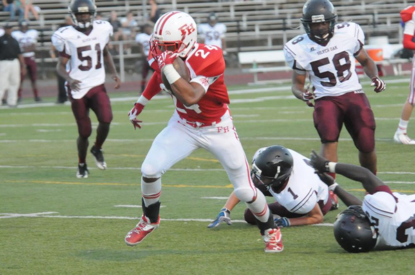 Sep. 6, 2013 CUMBERLAND — Ty Johnson scored three touchdowns and Dekari Darr two as the Fort Hill Sentinels piled up 525 yards of offense in trouncing the Silver Oak Academy Rams of Keymar, 54-6, in their season opener Friday at Greenway Avenue Stadium. Johnson, who rushed for 86 yards on six carries and caught two passes for 59 yards, scored on runs of six and 25 yards and on a 45-yard pass from quarterback Hunter Squires. Darr, the game’s leading rusher with 119 yards on nine carries, scored on runs of five and 16 yards. Alex Barnes rushed for 94 yards on six carries, and scored on a 17-yard run, while Squires scored on an 11-yard run and Ryan Smith on a 17-yard run. Squires was 5 for 8 passing for 95 yards, a touchdown and one interception. Johnson, Devin Shreve, Cody Dolly and Charlie Twigg intercepted passes for the Sentinels, while Trenton Swan and Cody Arigo recovered fumbles. The Sentinels got right out of the gate as the Rams turned the ball over on a fumble on the third snap from scrimmage that was recovered by Swan at the Silver Oak 22. After Darr picked up 11 on first down, Barnes gained six to set up Darr’s five-yard touchdown run up the gut, with Chris King’s kick making it 7-0 at 10:04 of the first. Fort Hill got the ball right back when Johnson intercepted a Yusef Johnson pass and returned it to the Silver Oak 29. After a Johnson gain of 22 the Rams defense stiffened, forcing a 30-yard field-goal attempt by King that missed. Shreve picked off a Jones pass for Fort Hill and returned it to the Rams 32, but the Sentinels fumbled the ball right back to miss out on another scoring opportunity. After a booming 50-yard punt by Silver Oak’s Nathan Watkins, the Sentinels needed just five plays to go 53 yards, with Squires hitting Johnson for 14 on first down, and Darr picking up 16 yards two plays later. On first-and-goal from the six, Johnson went over the left side for the touchdown at 3:07, with King’s kick making it 14-0, After a 45-yard punt from Watkins, the Sentinels took over at their six after a penalty and used just four plays to score again, with Arigo breaking off a 52-yard run to the Rams 32. Darr then picked up 11, with 10 more tacked on for a facemask penalty. From the 17, Barnes took it in for the score, with Shreve hitting Ryan Shives for the two-point conversion. After Fort Hill forced a three-and-out, Squires found Johnson for a 45-yard touchdown pass to make it 28-0. Two possessions later, Darr took it in from 16 yards at 1:44 of the half to cap off an eight-play, 79-yard drive. Then, after a Dolly interception at 1:30 to take the ball to the Rams 26, Squires ran for 15, then 11 for the touchdown, with King’s kick making it 41-0 at the half. To open the second half, Fort Hill used seven plays to cover 90 yards, with the big gains being 31 by Darr and 40 by Barnes, before Johnson took a reverse, on third-and-18 25 yards for the touchdown to make it 47-0. After a Twigg interception, Fort Hill took over at the Rams 45 and needed just four plays to score, with Jaraslov Candler picking up 24, and Smith gaining 19, then 17 for the touchdown, with King’s kick making it 54-0. Quarterback Jusef Jones scored the Silver Oak touchdown in the final seconds of the game. Fort Hill will host Keyser Friday night at Greenway.